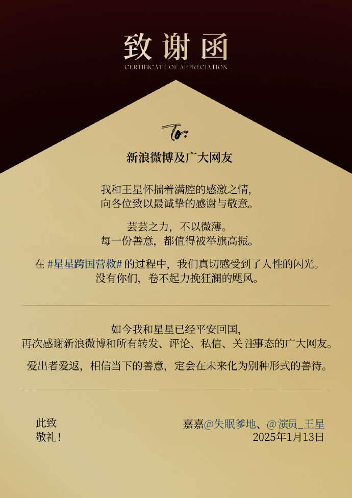王星及嘉嘉在給微博和網友的致謝函中寫道,每一份善意,都值得被舉旗高振。再次感謝新浪微博,感謝網友!在「星星跨國營救」的過程中,真切感受到了人性的閃光。如今他們已經平安回國,再次感謝新浪微博和所有轉發、評論、私信、關注事態的廣大網友。愛出者愛返,相信當下的善意,定會在未來化為別種形式的善待。