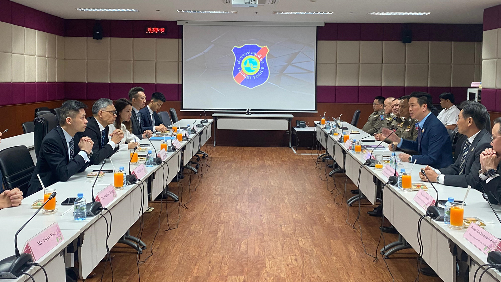 卓孝業與泰國旅遊與體育部副部長Jakkaphon Tangsutthitham(右二)和泰國旅遊警察局局長Saksira Pheuak-um(右三)會面。