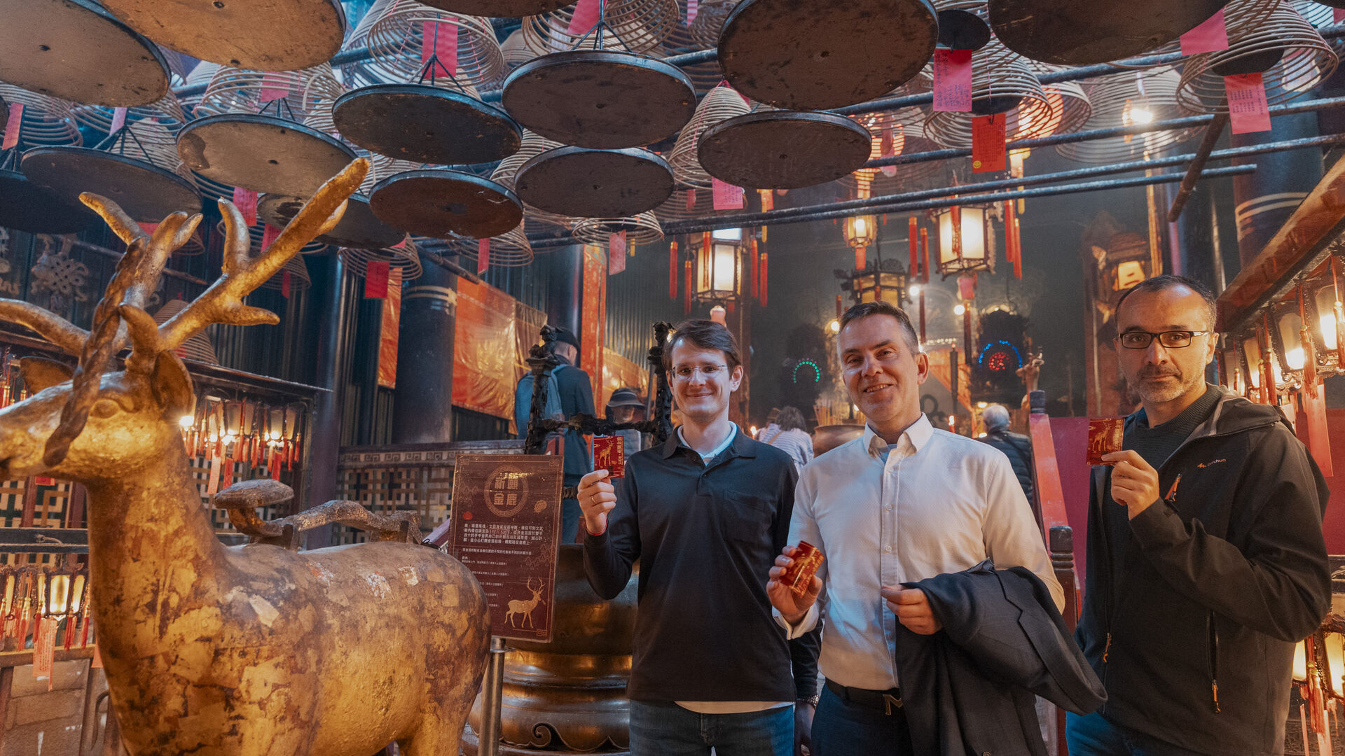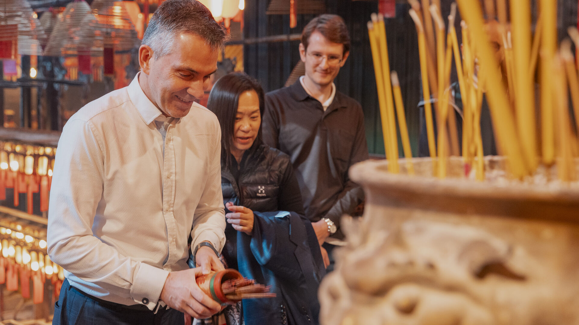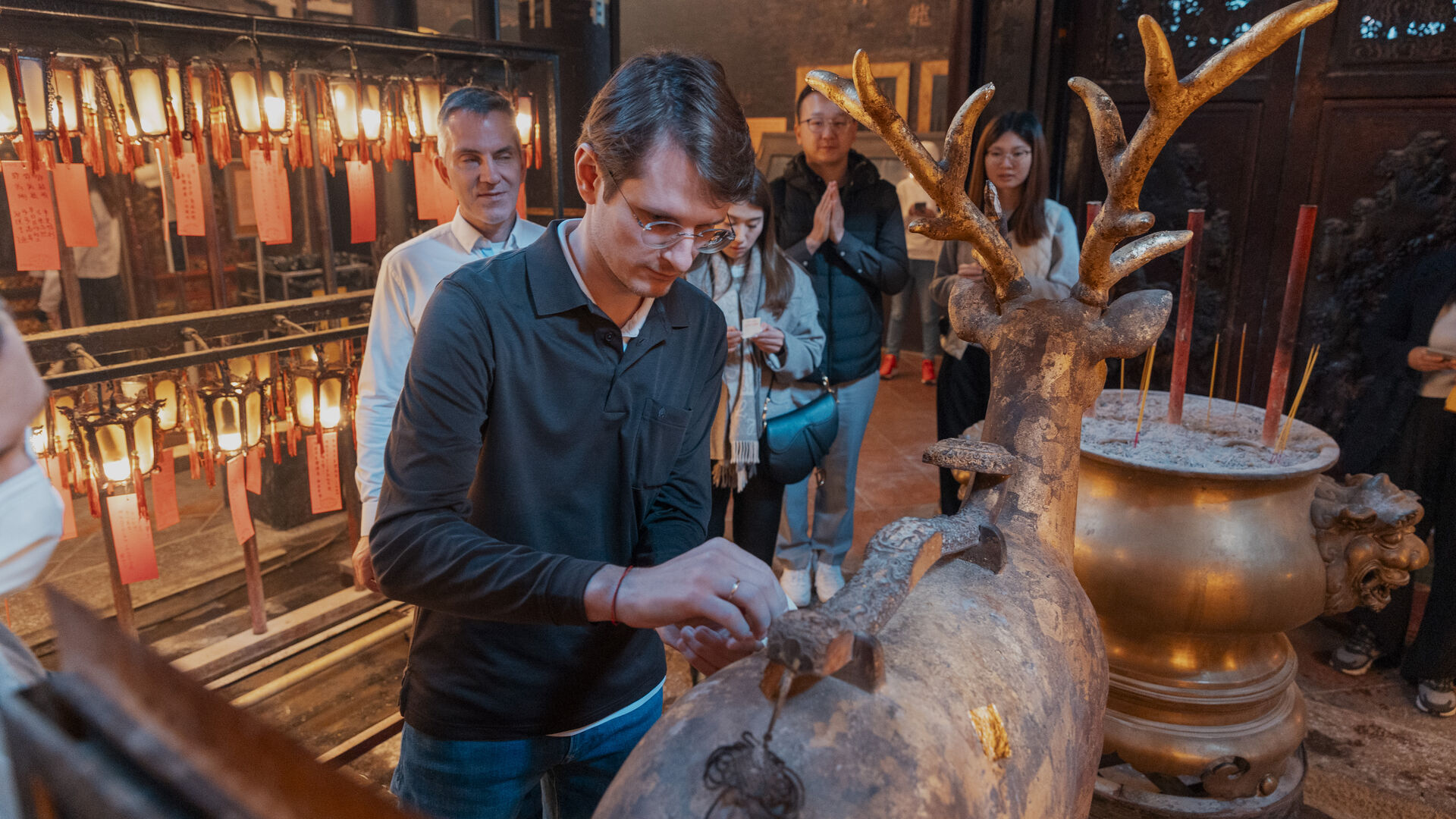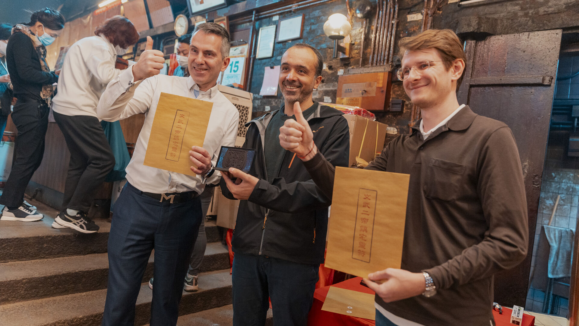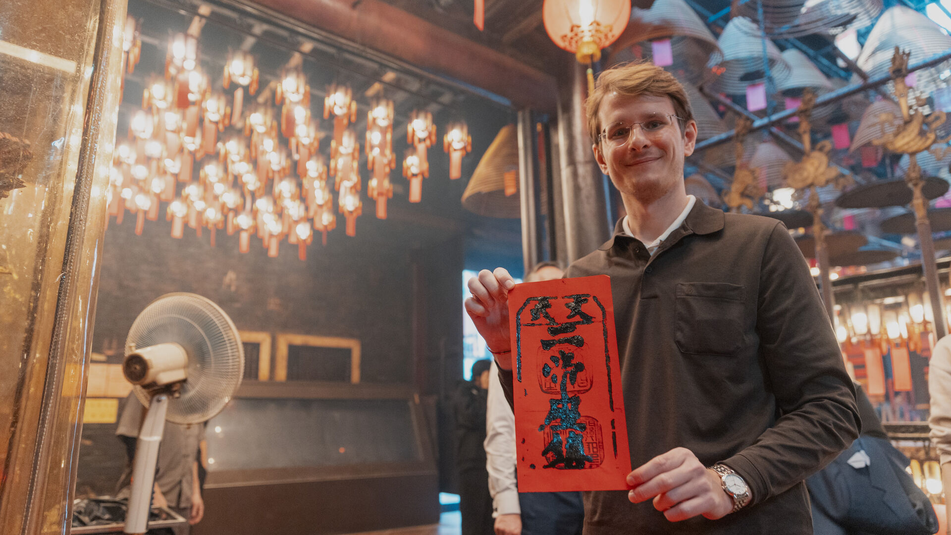 首度來港、卡塔爾商業諮詢服務企業 Soutien Group 合伙人 FelixKatterl,一嘗在文武廟求籤和貼金箔祈福,「我祈求身體健康、富貴榮華和世界和平。」來自奧地利的他認為這些傳統習俗很引人入勝,與家鄉非常不同,因此他希望接觸民間文化,觀察本地人的日常生活。到訪大館亦令他對香港的文化古蹟有更多的了解,「大館的活化發展十分優秀,現在有餐廳、酒吧等設施;當我再踏足建築物內部,則別有洞天,這裏的歷史古蹟,如監獄牢房,得到了很完善的保育。」Felix會繼續留港數日,與本港客戶洽談生意,望為公司開拓新市場。他笑言急不及待攜同家人再次訪港,亦會推薦其他人到香港旅遊。