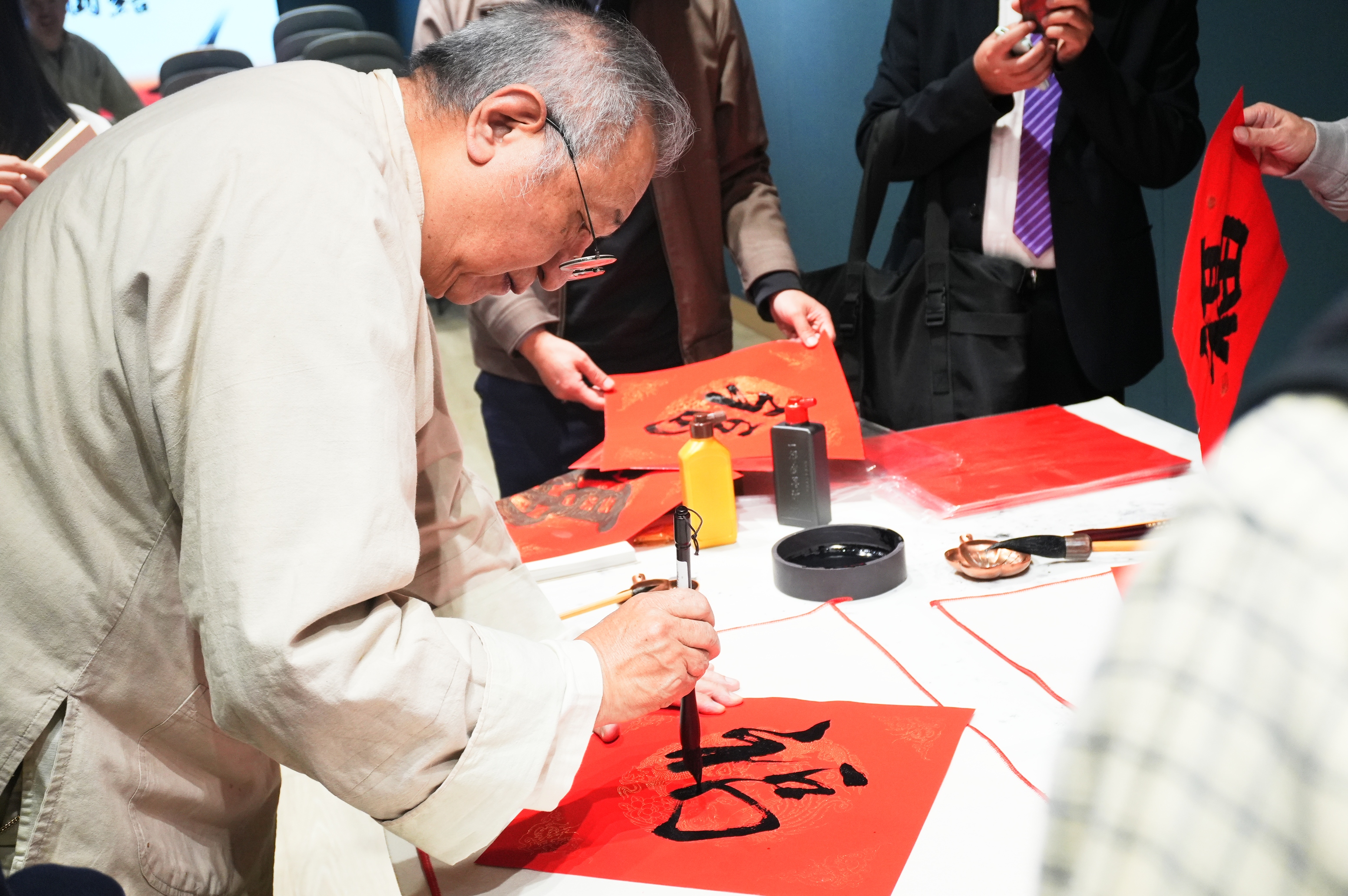 在一本讀書會名家講座現場,蘇士澍與鄭培凱寫作「福」字贈予同場嘉賓留念,共慶新春佳節的將臨。