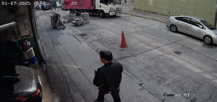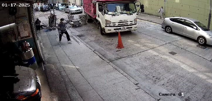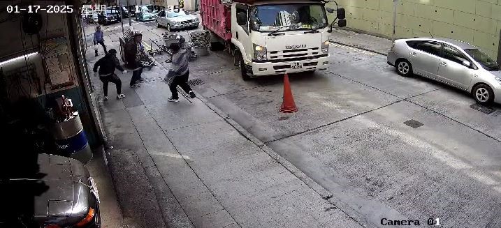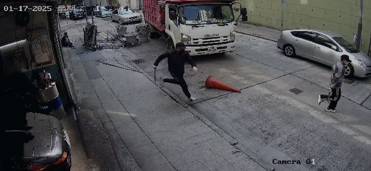 現場有天眼直擊事主遇襲過程,片中先有一部白色私家車駛走,穿黑衣的事主背向鏡頭,在行人路上邊行邊看手機。一名戴cap帽黑衫男突持刀由對面馬路從後衝向事主,朝着事主雙腳落刀狂斬,事主反抗,稍後再有一名穿橫間上衣的男子亦衝過馬路,與同黨合力狂斬事主,事主不支倒地。橫間衫男先停手離開,逃走時撞低路中擺放的雪榚筒,而黑衫男仍不心息,繼續手起刀落狂劈事主,直至事主倒地不起。
