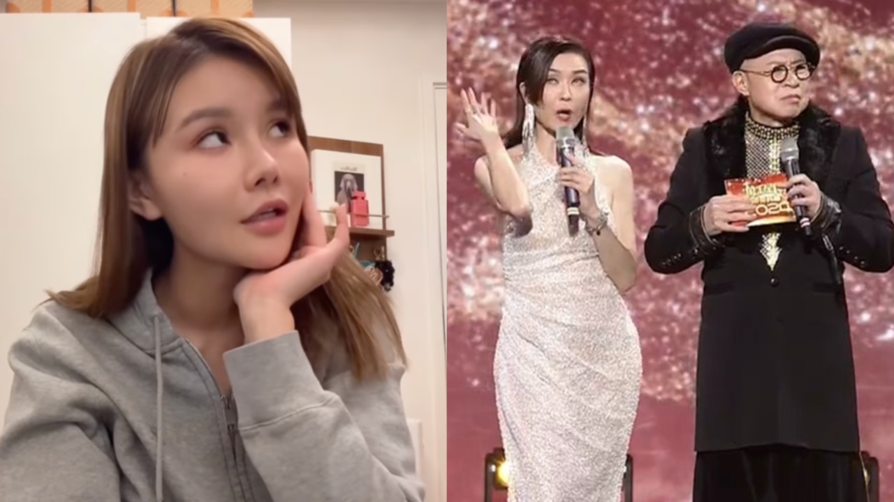伍姑娘在萬千星輝頒獎典禮上惡搞扮五索狂反眼兼撥頭髮。(圖:萬千星輝頒獎典禮截圖)