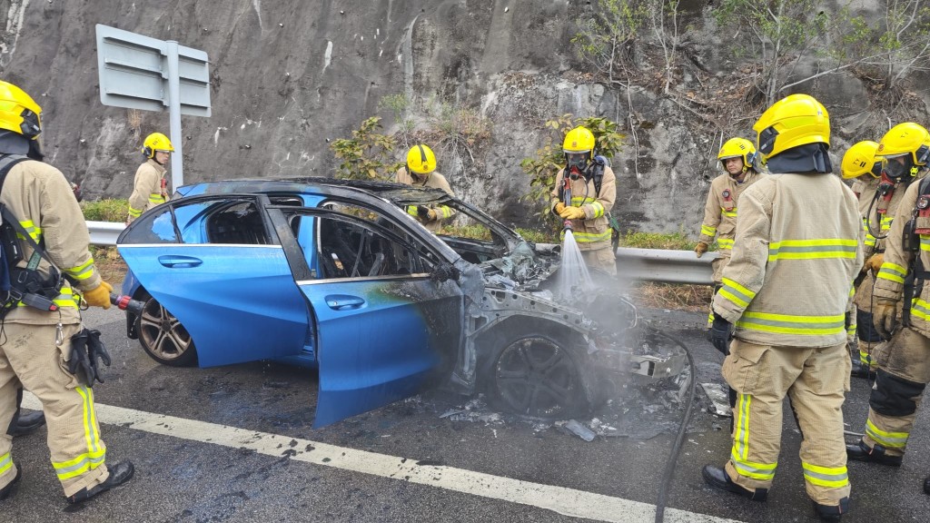 涉事的平治私家車車頭嚴重焚毀,消防繼續射水降溫。據車主劉先生表示,數年前以數萬元購入該車,至今車齡約10年。今晨前往機場後返回市場途中,私家車在青馬大橋時車頭開始冒煙,惟橋上沒有安全位置停車,劉先生一直靠左行駛,當駛至長青公路時遂將車停至路肩後,立即棄車逃生。