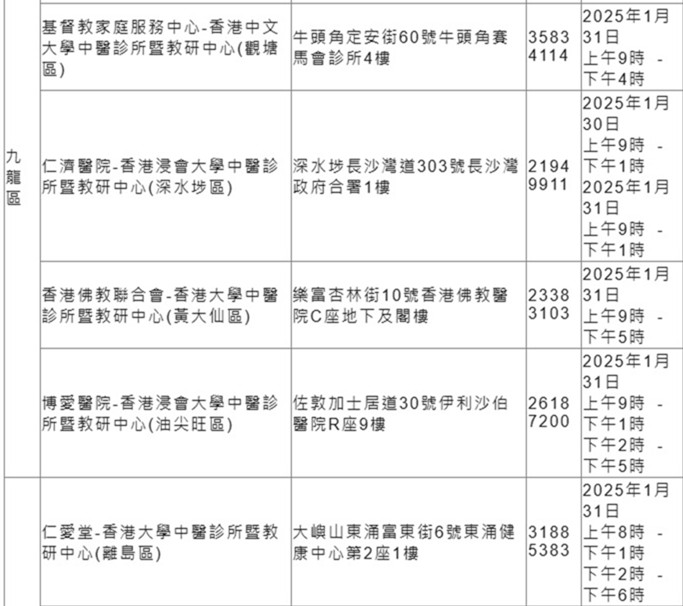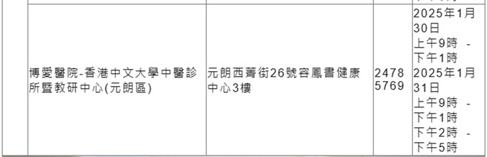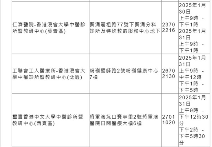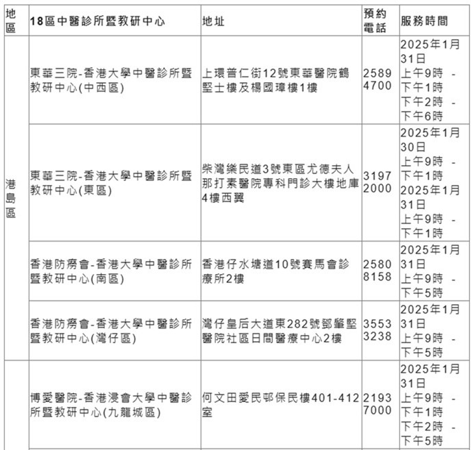 另外,18區中醫診所暨教研中心(中醫診所)亦會於1月30日至31日特別加開政府資助中醫門診診症時段,並於假期前後(1月28日、2月1日及3日)加強服務,以應對市民的求診需要。求診人士可於中醫診所的服務時間致電或使用「18區中醫診所」流動應用程式(適用於曾登記使用18區中醫診所服務的求診人士)預約服務。市民亦可瀏覽醫管局中醫動網頁獲取有關中醫服務的最新資訊。