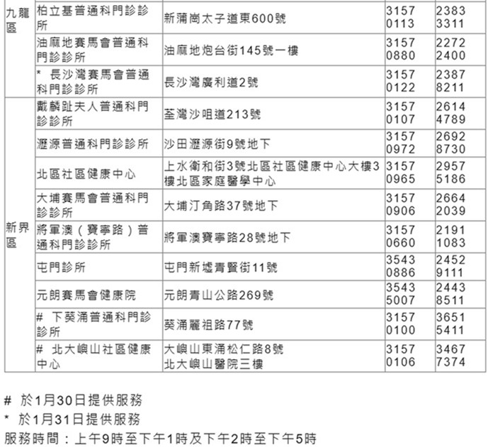 新春期間普通科門診服務安排: