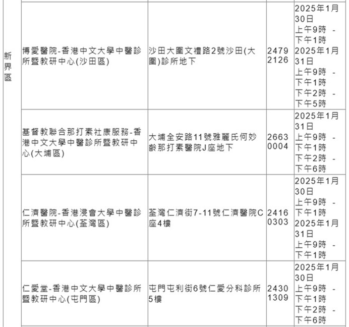 新春期間18區中醫診所暨教研中心服務安排: