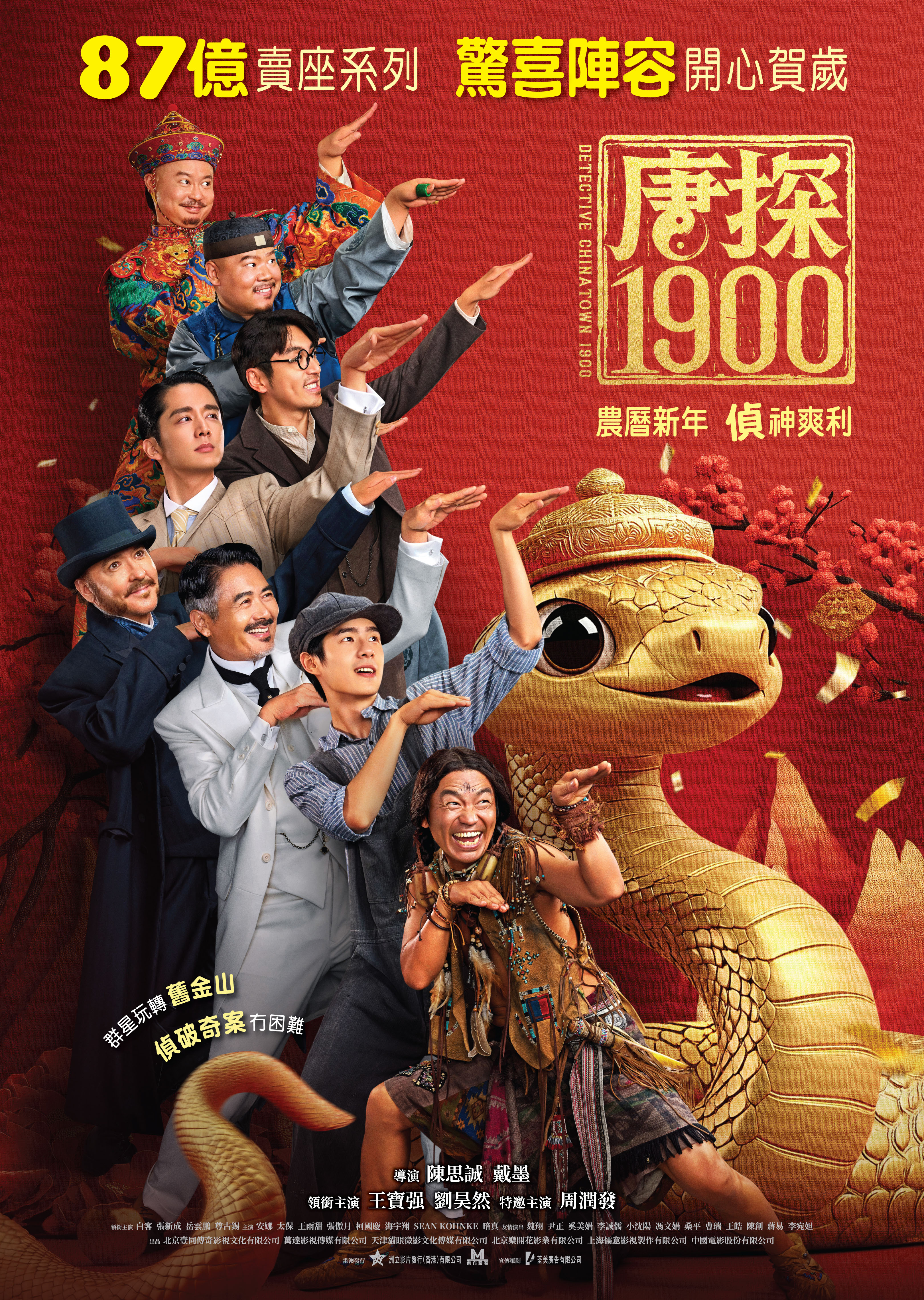 【橙訊】87億賣座系列《唐人街探案》又來啦!全新前傳《唐探1900》以驚喜陣容,同大家開心賀歲。今集顧名思義,將會帶觀眾回到1900年的美國舊金山,系列最強拍檔王寶強、劉昊然以新角色、新人設回歸,引爆新鮮喜感;香港觀眾熟悉的最貼地影帝周潤發重磅加盟,飾演唐人街堂主,霸氣衝天!三人率領群星玩轉唐人街:《年會不能停!》白客、《三大隊》張新成、《非誠勿擾3》岳雲鵬、荷里活男星尊古錫(John Cusack)熱鬧助陣。