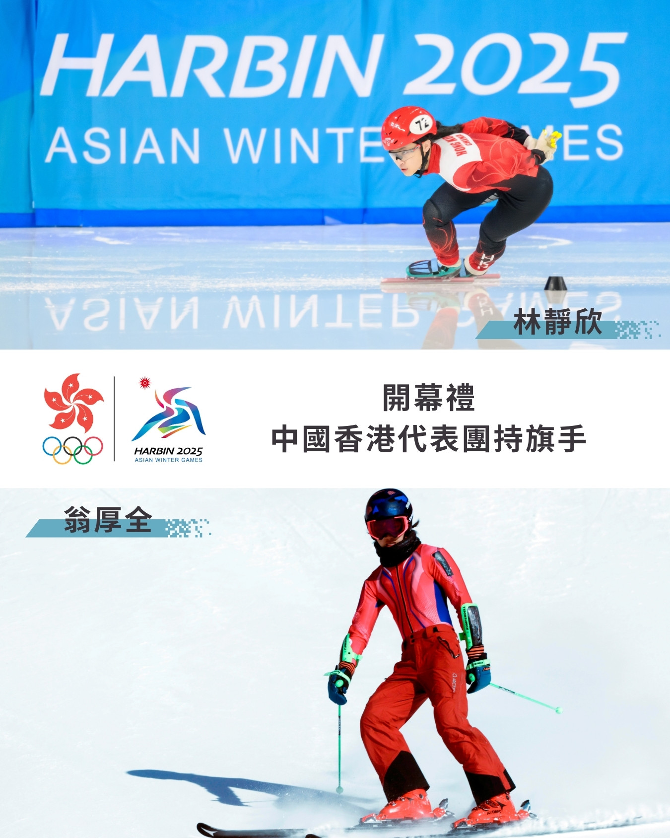 【橙訊】亞洲冬季運動會開幕禮今晚8時在哈爾濱國際會展體育中心舉行,中國香港代表團將由林靜欣(短道速滑)和翁厚全(高山滑雪)擔任持旗手。