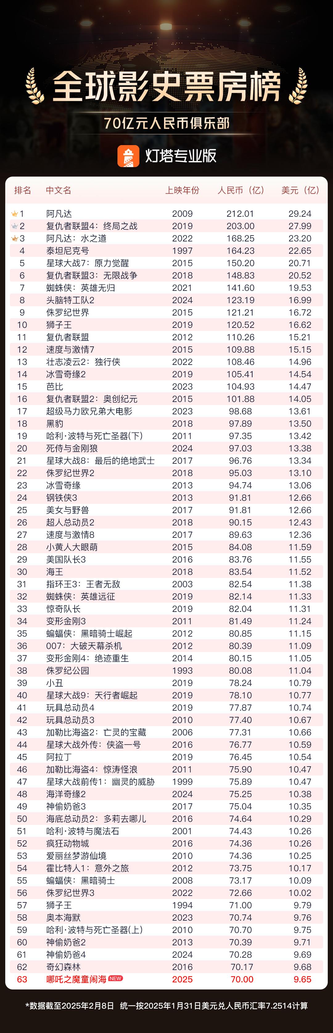 【橙訊】央視報道指,據燈塔專業版數據,截至2月8日,影片《哪吒之魔童鬧海》(簡稱《哪吒2》)票房(含預售)突破70億(人民幣,下同),成為全球影史第63部票房超過70億的影片,打破70億票房俱樂部荷里活影片壟斷。