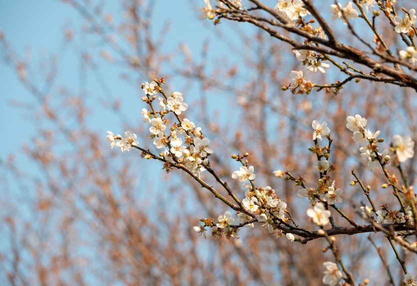 漫步於公園之中,層層曡曡的白梅樹鋪展開來,點綴於枝頭上的花苞,就像是點點白色雪花,隨風飄拂,空氣中更不時彌漫着陣陣梅花淡雅的香氣,暗香浮動,與周圍的亭台樓閣相映,盡顯古韻。