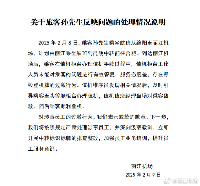 麗江機場於9日晚通過微博發布了針對上述博主反饋問題的處理通報。通報指出,在辦理值機手續期間,值機櫃臺工作人員未能妥善回應旅客詢問,服務態度欠佳,並出現了撕毀登機牌的不當行為。機場表示,對涉事員工的過激行為表達誠摯的歉意,並將依據相關規定對涉事員工進行嚴肅處理。