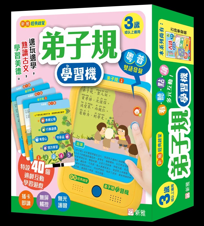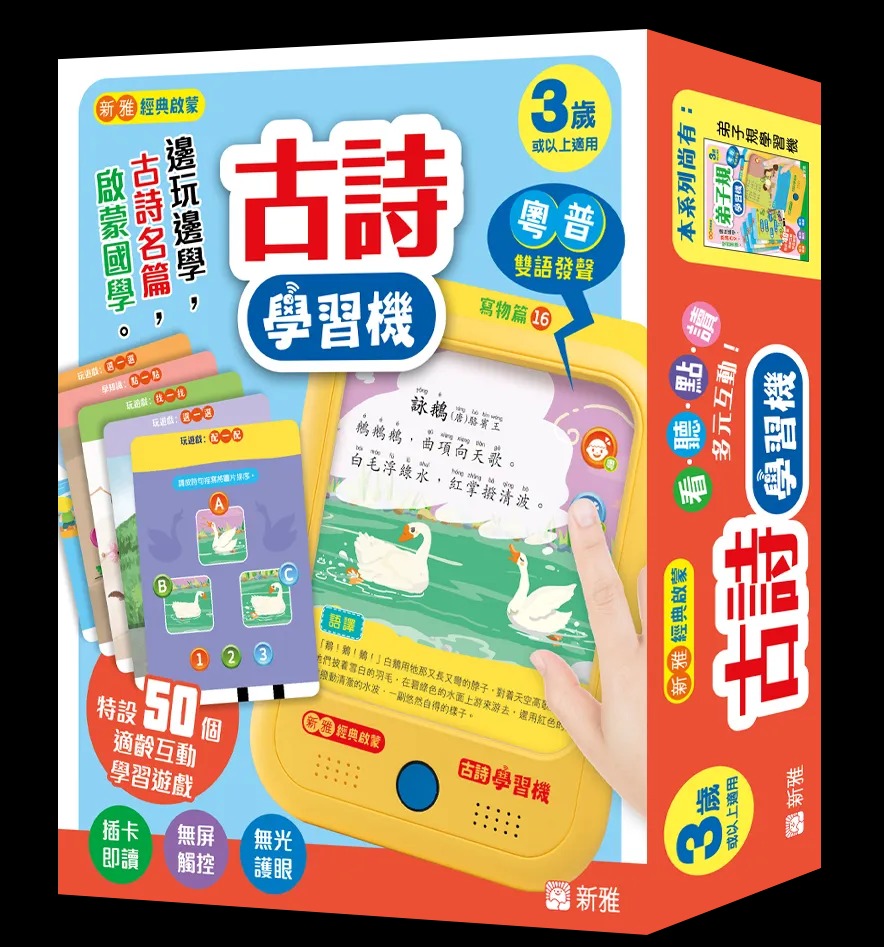 【橙訊】古詩是中國文學的瑰寶,通過學習古詩,孩子可以提高語言表達能力,豐富詞彙量,培養對文學的興趣與鑒賞能力。《弟子規》作為經典啟蒙讀物,教導孩子禮儀、道德,傳承中華美德,讓他們從小認識中華文化,塑造全面發展的人格。這些國學經典對孩子成長意義深遠,新雅文化特別推出《古詩學習機》及《弟子規學習機》幫助孩子在玩中學,以輕鬆愉快的模式接觸古詩和弟子規,達到國學啟蒙的目的。