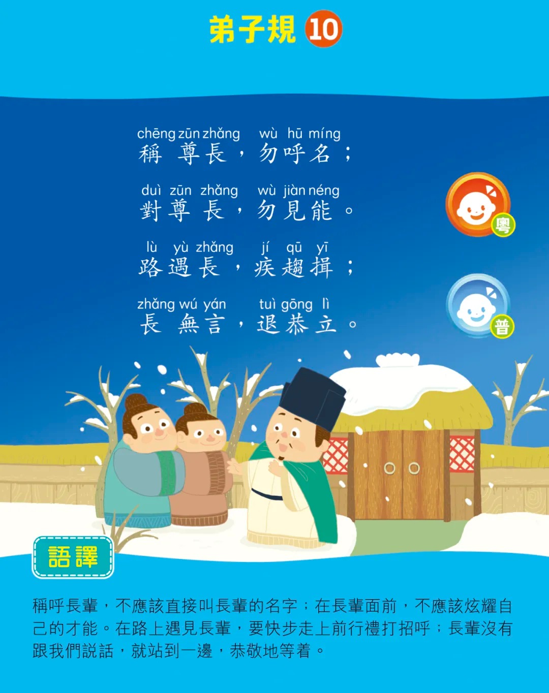 弟子規是清朝以來廣泛流傳的兒童經典啟蒙讀物。它根據聖人孔子的教誨編成,教導孩子在家、在外、待人接物、為人處世和求學五方面要遵守的禮儀和規範。通過插卡即讀的方式,聆聽弟子規的粵語及普通話朗讀音頻。學習卡背面還精心設計40個互動學習遊戲,寓教於樂。助力幼兒經典啟蒙,輕鬆認識中華文化,學習立志修身,傳承中華美德。