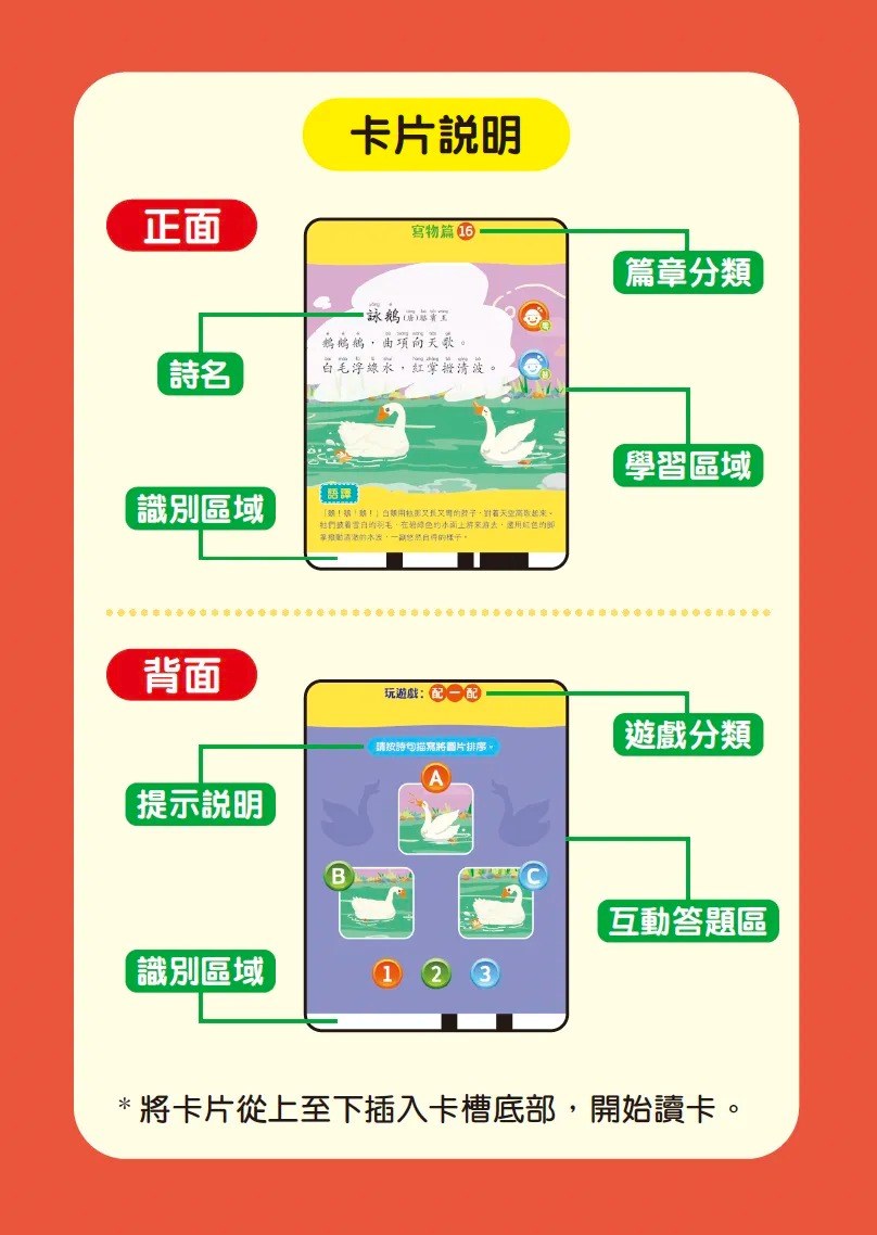 古詩學習機精選中國古代50首家喻戶曉的古詩,分為山水田園篇、寫物篇、寫景篇、抒情篇及送別篇五個篇章。通過插卡即讀的方式,聆聽古詩的粵語及普通話朗讀音頻。學習卡背面還精心設計50個互動學習遊戲,寓教於樂。助力幼兒經典啟蒙,在反覆聆聽和吟誦中感受詩歌之美,傳承中華文化的特色與智慧。