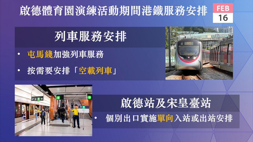 港鐵表示,因應演練,會在屯馬綫宋皇臺站和啟德站相應調整車站安排和列車服務,以方便參加者往返會場。在活動結束散場時人數眾多,當局及車站或會實施人群管理措施,乘客有可能需要額外等候時間,在站外輪候分批進入車站。