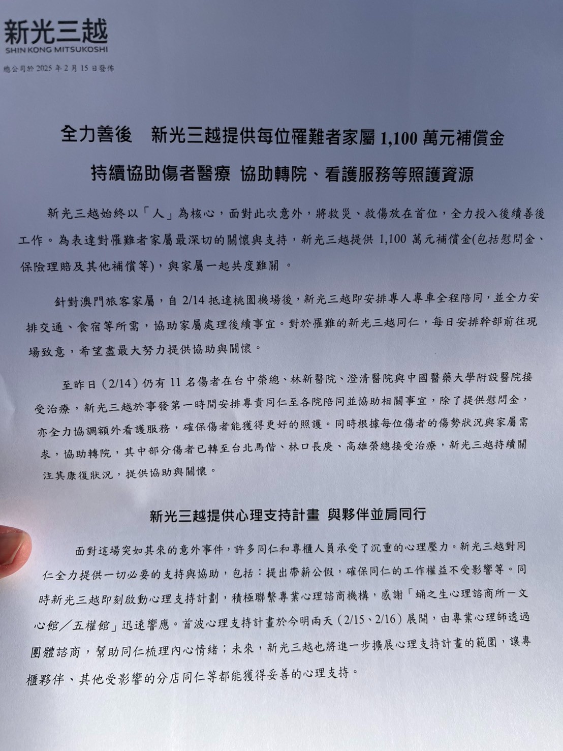 新光三越表示,面對這場突如其來的意外事故,許多員工和專櫃人員皆承受了沉重的心理壓力,公司將全力為員工提供一切必要支持與協助,包括可帶薪休假、確保同仁工作權益不受影響;同時公司也已聯繫專業心理諮商機構,首波心理支持計劃於15、16日展開,將由心理師透過團體諮商,幫助員工梳理內心情緒;未來也將進一步擴大心理支持範圍,讓專櫃夥伴及其他受影響的分店員工都能獲得適切的心理協助。
