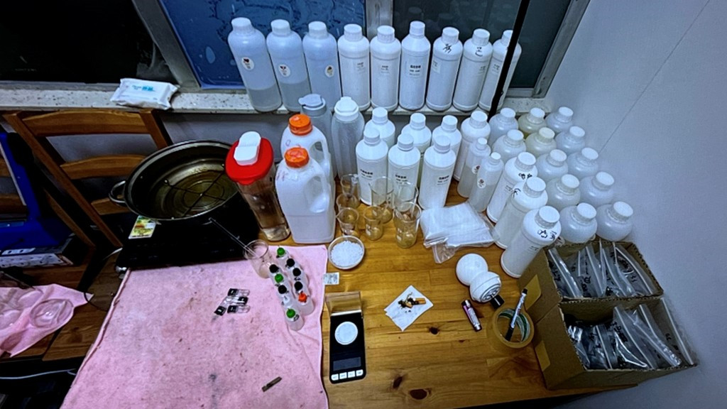 警方說,這個太空油毒品製造中心,主要將甘油加入液態依托咪酯,再製成太空油毒品,過程十分粗劣簡陋,沒有任何衛生及防護設施,相信現場檢獲的液態依托咪酯及甘油,共可製作約1600粒太空油毒品煙彈,市值係約80萬元。