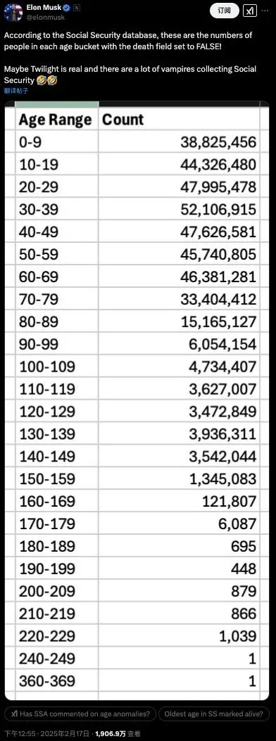 馬斯克公布的統計圖表顯示,社保數據庫記錄有3.98億「活人」,而美國官方人口數據僅為3.41億。即便計入持社會安全號碼的外國公民,其數量也僅在1500萬至2000萬之間,存在顯著差額。更驚人的是,數據庫中竟有近150萬名超過150歲的老人記錄,包括一名年齡介於240至249歲和一名360至369歲的老人。馬斯克調侃稱,或許真有「吸血鬼」存活數百年,且仍在領取美國政府福利,並稱其為「史上最大騙局」。
