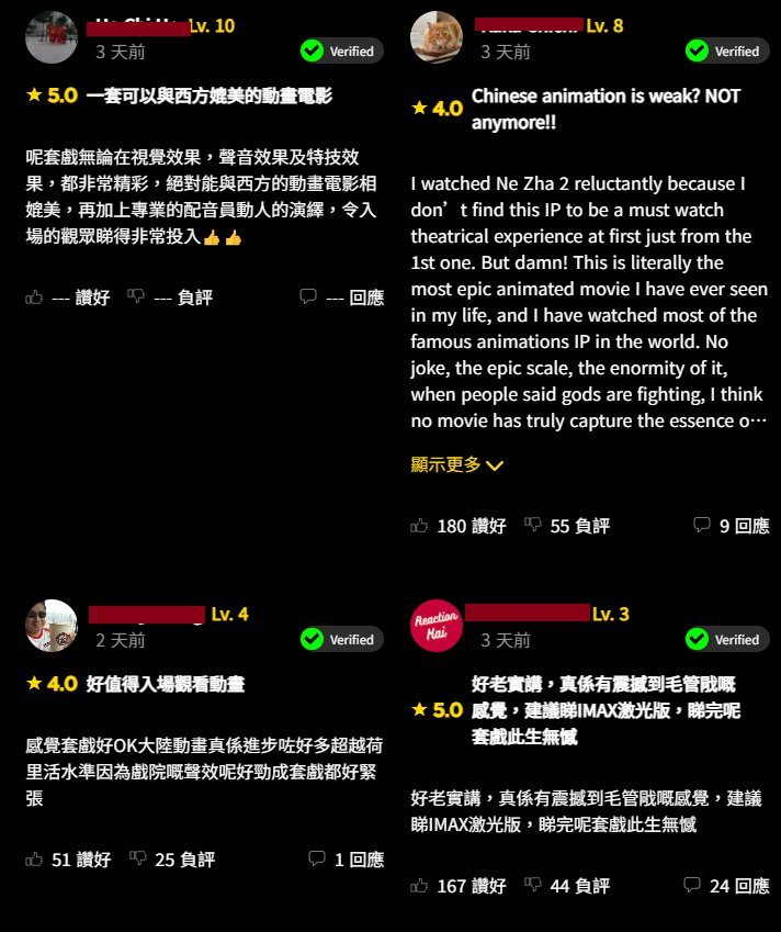 有觀眾稱,「呢套戲無論在視覺效果,聲音效果及特技效果,都非常精彩,絕對能與西方的動畫電影相媲美,再加上專業的配音員動人的演繹,令入場的觀眾睇得非常投入」;還有觀眾稱「真係有震撼到毛管戙嘅感覺,建議睇IMAX激光版,睇完呢套戲此生無憾」。