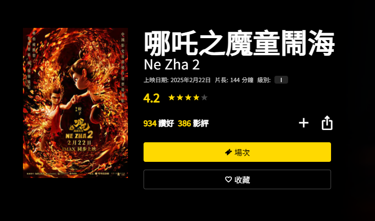 《哪吒2》在HK movie獲得了4.2的較高評分。