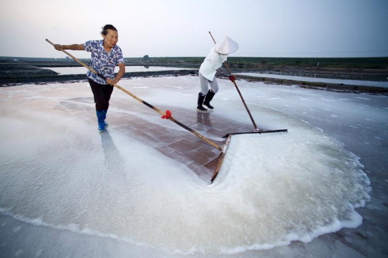 清晨,朝陽剛剛升起,福建泉州泉港區山腰鹽場工人便開始了一天的勞作。