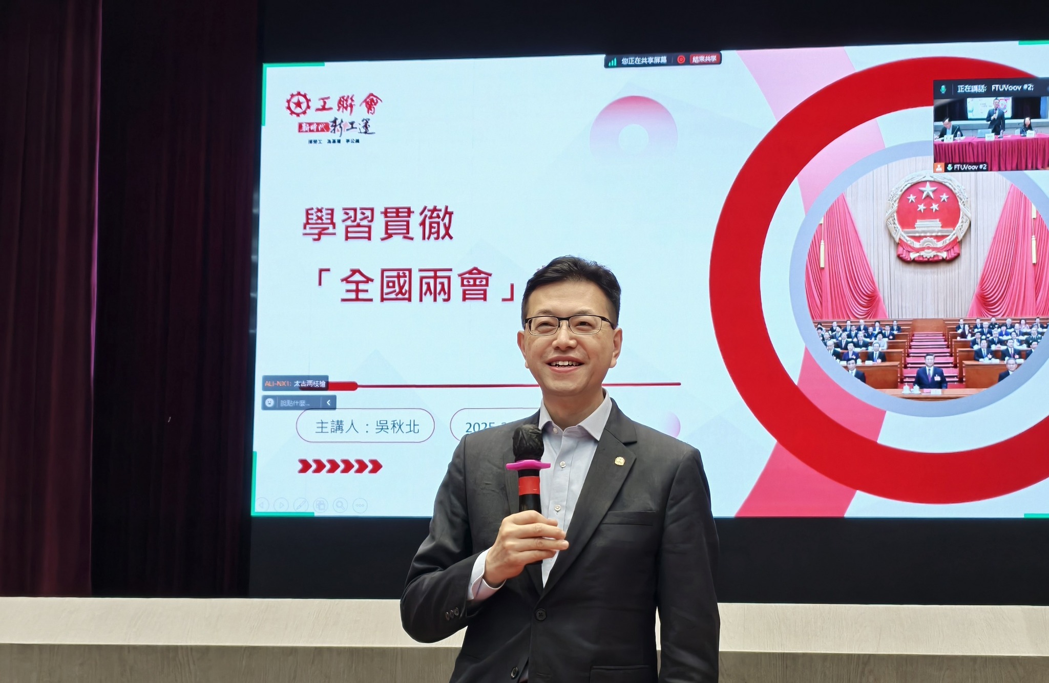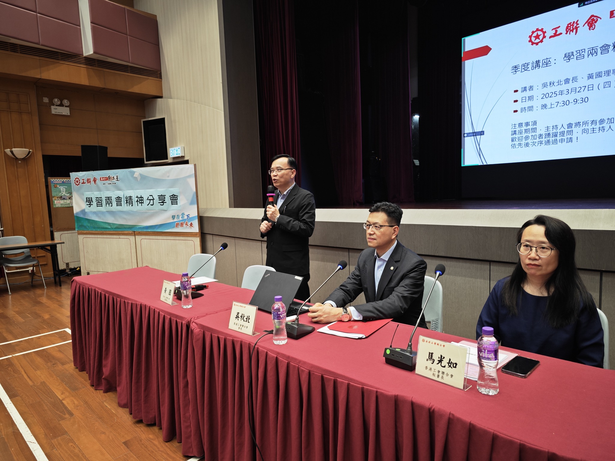 【橙訊】第十四屆全國人民代表大會第三次會議及中國人民政治協商會議第十四屆全國委員會第三次會議(兩會)在北京圓滿閉幕。工聯會昨晚(3月27日)假座工人俱樂部9樓舉行學習「兩會精神」分享會講座,由港區全國人大代表副團長、工聯會會長吳秋北,全國政協提案委員會副主任、工聯會理事長黃國以及全國政協委員、工聯會副會長兼秘書長馬光如主講,向工會理事、地區幹事、工聯會區議員、職員及義工傳達「兩會精神」,分享「兩會」的重點內容與意義,線上線下千多人參加。