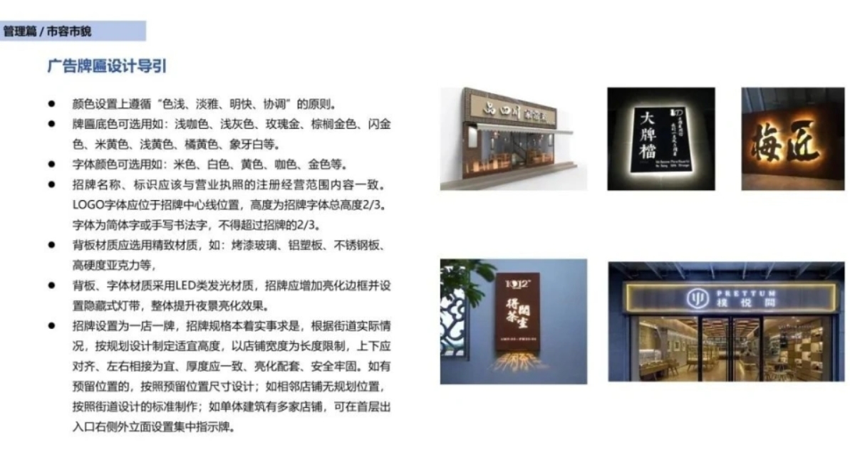 經查詢,三河市自然資源規劃局去年12月曾發布《三河市城市規劃建設管理導則》。其中,關於廣告牌匾的設計導引,要求顏色上遵循「色淺、淡雅、明快、協調」的原則;牌匾底色可選用如淺咖色等;字體顏色可選用如米色、白色等。該《導則》還要求,除國際國內連鎖品牌,不允許用紅藍底色或字樣;字體不允許用通用電腦體,應該有設計。不過,最後的「附加說明」顯示,《導則》內除明確禁止內容外,均為指導性意見。
