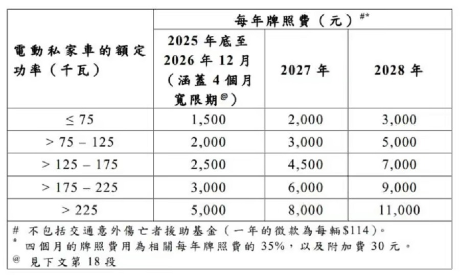 根據運輸及物流局提交的立法會文件,電動私家車牌費將按額定功率分為五個層級,取代現行按車重計算的方式。第一層級為額定功率 75 千瓦或以下,2025年底至2026年12月牌費為1,500元,至2028年增至3,000元。第二層級(75 至 125 千瓦)牌費由2,000元增至5,000元;第三層級(125至175千瓦)由 2,500元增至 7,000元;第四層級(175至225千瓦)由3,000元增至9,000元;第五層級(225 千瓦以上)由 5,000元增至11,000元。