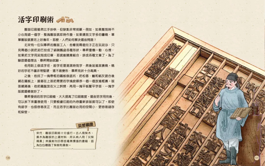 不過,我們的祖先明白,雖然雕版印刷術比手寫抄書方便得多,但如果遇到又厚又長的書,光是雕版就要花上幾個月,甚至幾年。那麼,他們如何克服這個困難?又是誰發明更先進的印刷技術呢?讓我們翻閱這本書,了解中國印刷術的故事吧!