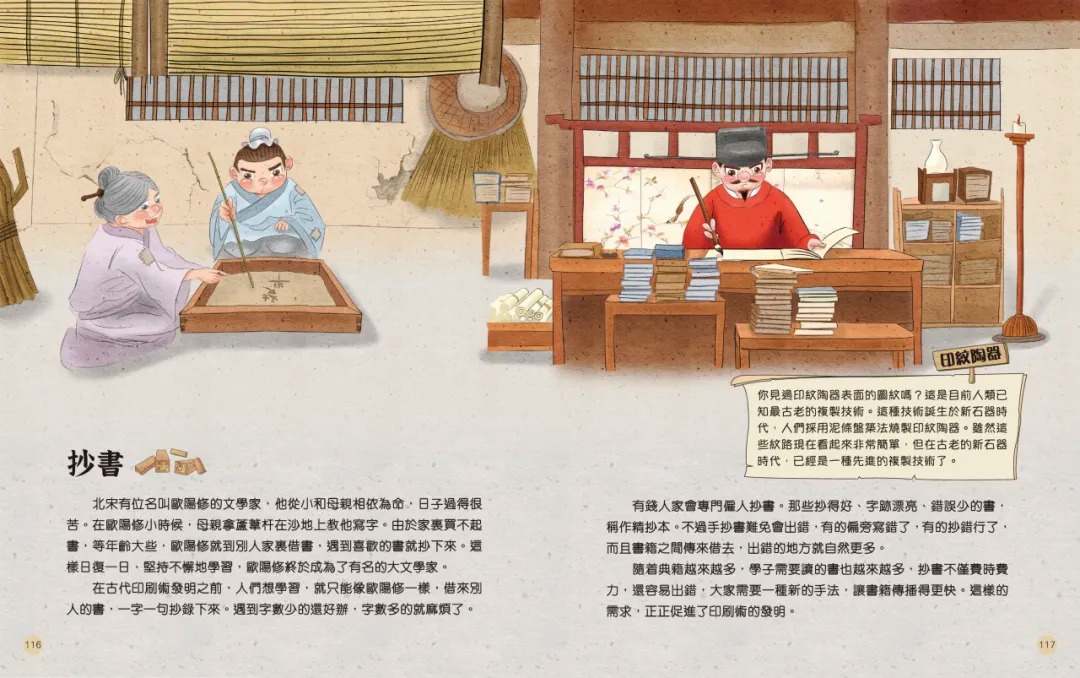 古時,所有書籍都要靠人手抄寫,這種方法費時費力,又容易出錯。因此,中國人發明雕版印刷術,工匠製作一套雕版,就能反覆使用,印製出數以千計的書籍,使許多典籍得以流傳至今。