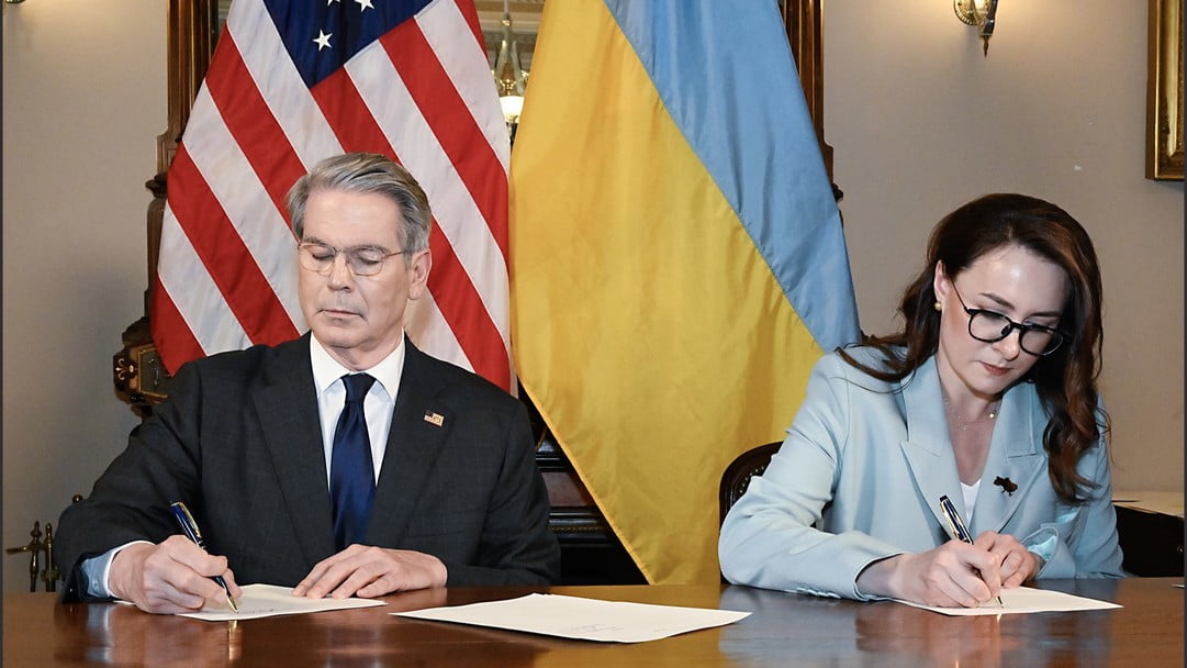 美國財長貝森特與烏克蘭第一副總理兼經濟部長斯維里登科,周三在華盛頓簽署礦產協議。資料圖片
