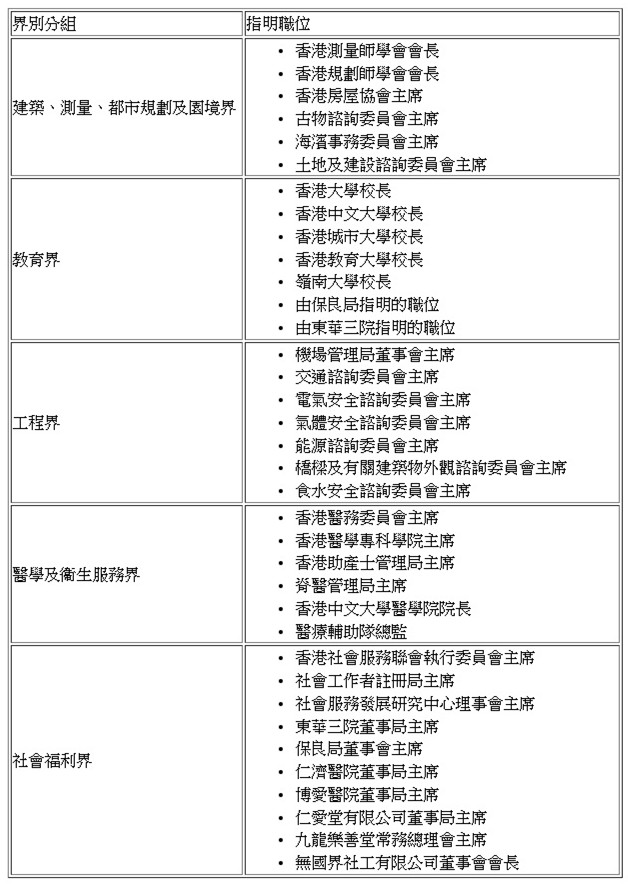 根據《行政長官選舉條例》(第569章)附表第5J條,擔任該附表第2A部訂明的指明職位的人士可登記為選委會當然委員。如有關人士沒有資格登記為當然委員或身兼多於一個指明職位,可指定由在相關團體中擔任職位的另一人登記為當然委員。