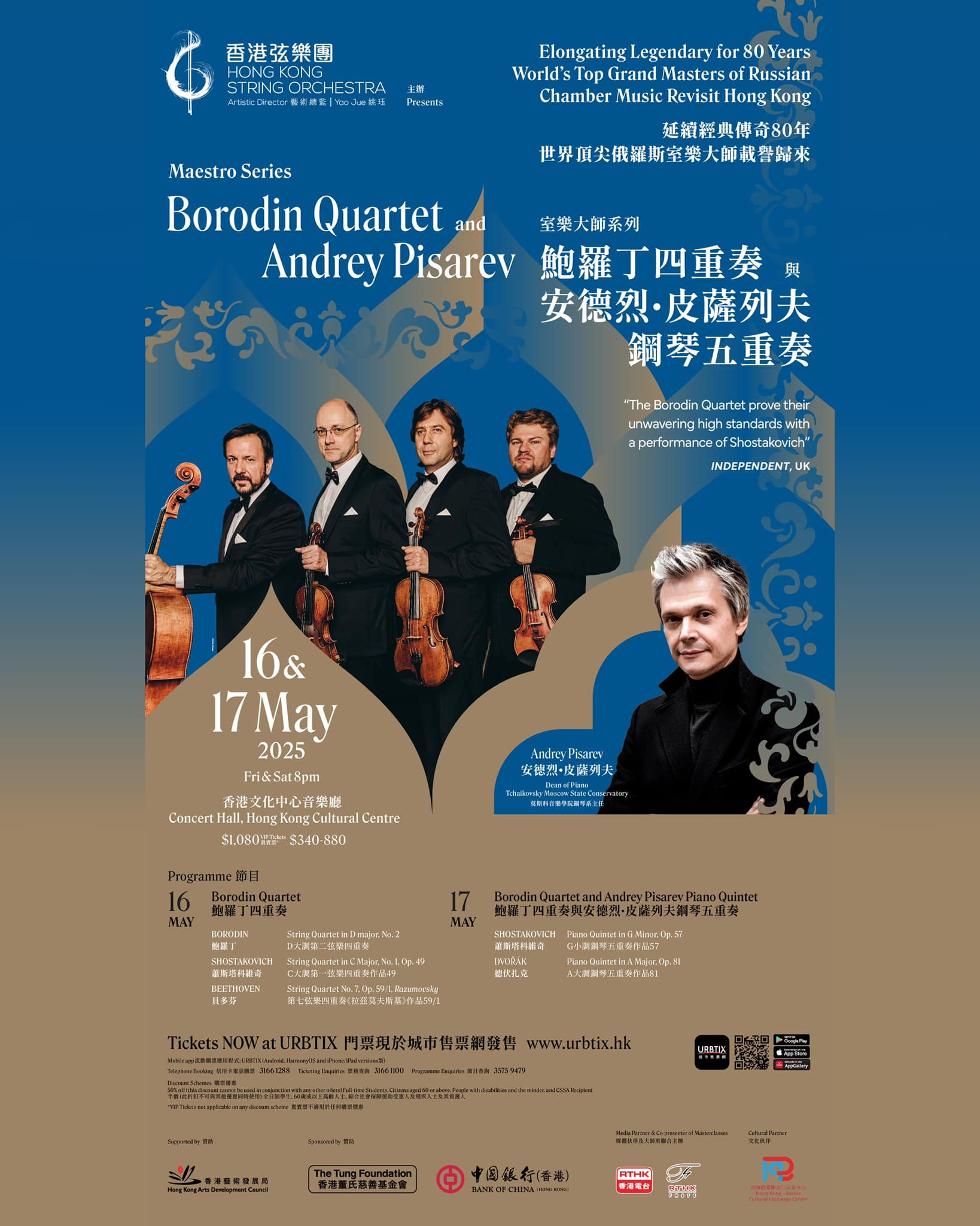 【橙訊】香港弦樂團舉辦「室樂大師系列-鮑羅丁四重奏與安德烈·皮薩列夫鋼琴五重奏音樂會」,攜手鮑羅丁四重奏(Borodin Quartet)及俄羅斯功勳藝術家、鋼琴家安德烈·皮薩列夫(Andrey Pisarev),共同奏響鮑羅丁、肖斯塔科維奇、貝多芬、德伏扎克的室樂經典作品。本次音樂會鮑羅丁四重奏首次應允與香港本地青年藝術家合作,將和香港弦樂團的樂手共同呈現弦樂經典,體現了國際高水準大師對本港青年樂手的認可,亦鼓勵更多香港青年超越自我。