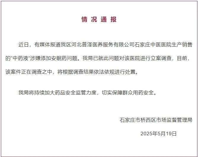 石家莊橋西區市場監管局今日就「消費者在石家莊一家醫院購買治療失眠的中藥飲劑中含有安眠藥」一事發布通報,稱已對涉事醫院立案調查,案件正在處理中。通報稱,近日,有媒體報道橋西區河北普澤醫養服務有限公司石家莊中醫醫院銷售的「中藥液」疑添加安眠藥,市監局將依據調查結果,依法採取措施。同時,市監局將強化藥品安全監管,確保民眾用藥安全。