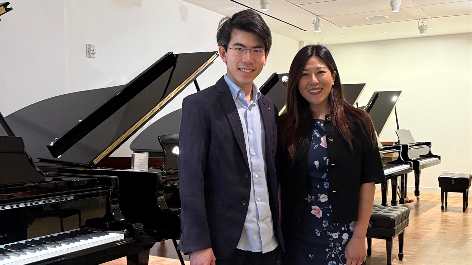 何美智(右)說,沈靖韜(左)的成就鞏固了香港作為培育優秀音樂人才基地的美譽。