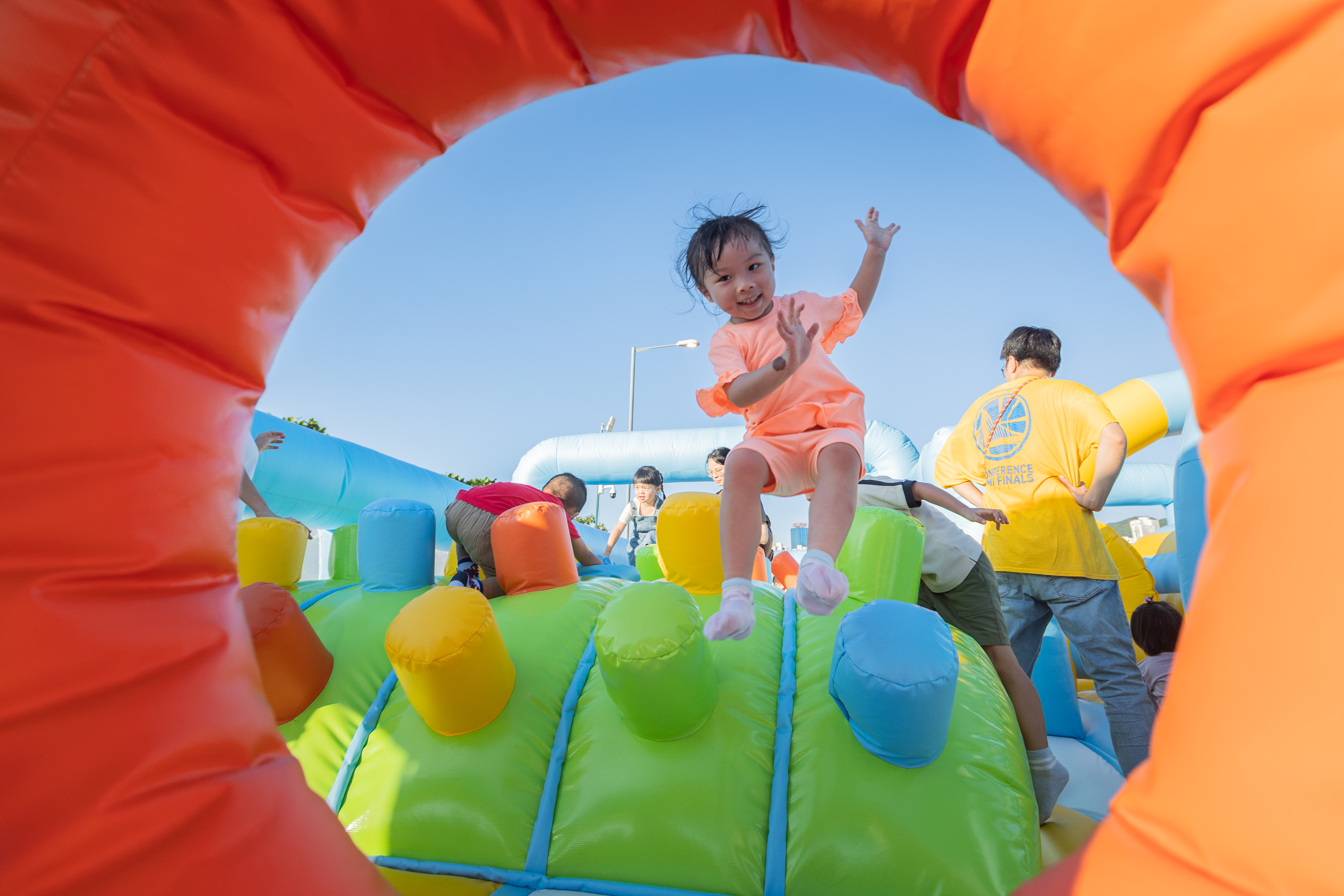 參加者進入充氣彈床設施,依次序穿越各個關卡,盡情享受跳在半空的快樂。