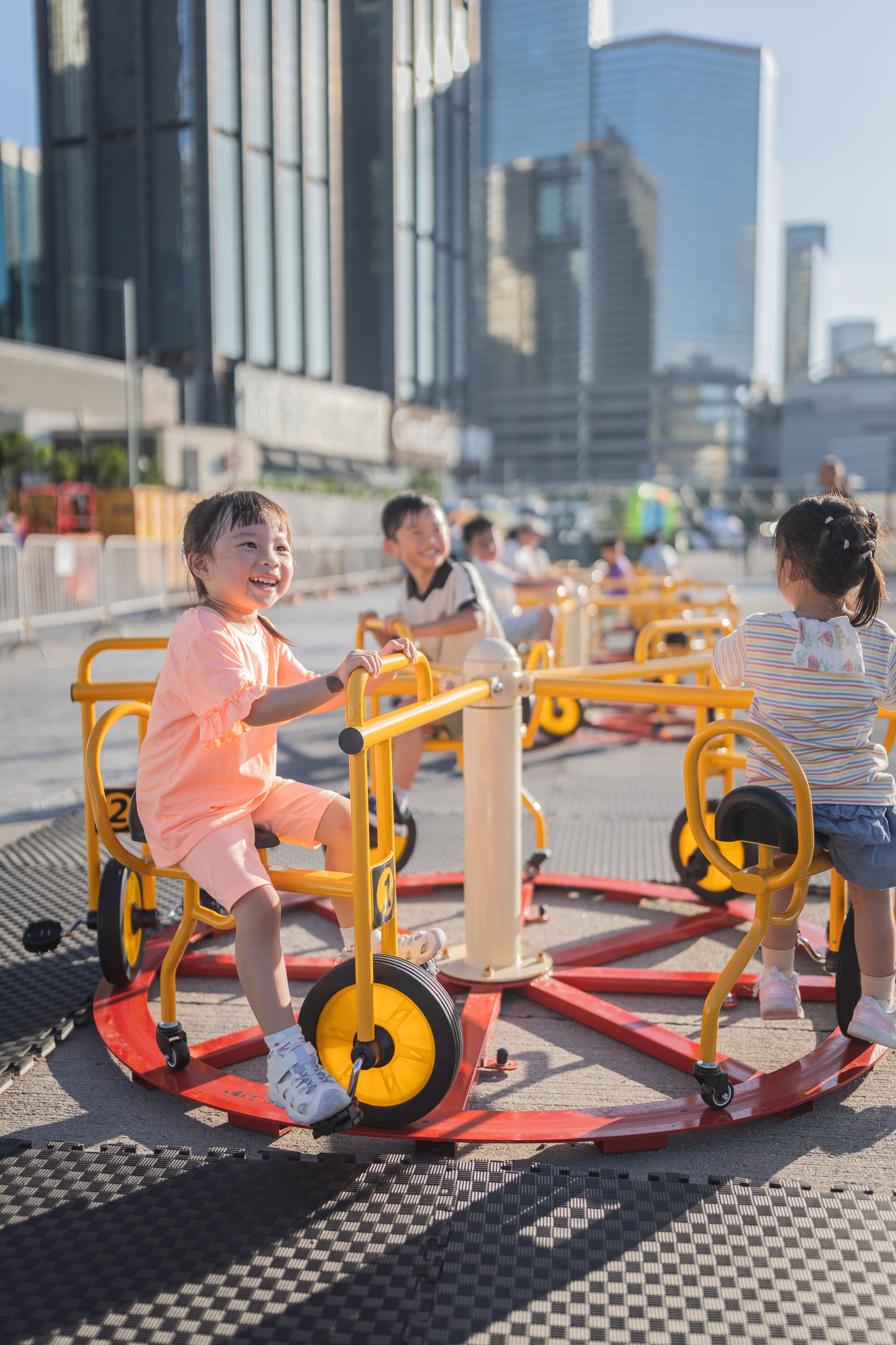 最多可容納五人同時參與。參加者坐上大型單車環,合力踩動踏板,讓整個單車環轉動起來,體驗團隊節奏與運動樂趣。