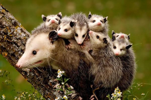 這隻把一家都扛在身上的叫負鼠,是不是和你家中的那位很相似呢?片中的應該是北美負鼠(Didelphis virginiana),和袋鼠一樣是有袋的哺乳類動物,棲息在北美洲格蘭德河以北。體積和家貓差不多,是獨行及夜間活動的動物。