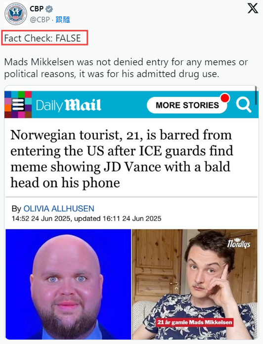 美國海關及邊境保護局通過X平台表示「事實核查:錯誤」,並附上了《每日郵報》的報道截圖,該報道標題為「ICE警衛在一名21歲的挪威遊客的手機上發現了萬斯的光頭表情包,隨後該遊客被禁止進入美國」。官員們補充說明,米克爾森被拒入境並非由於表情包或政治原因,而是因為他承認有吸毒行為。