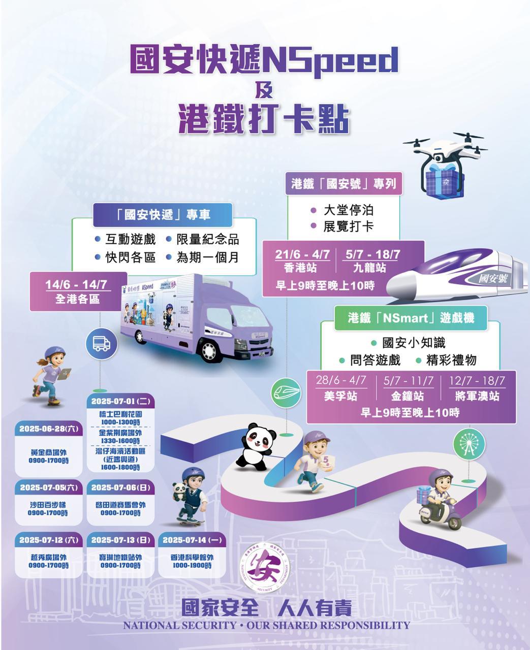 【橙訊】為慶祝《香港國安法》公布實施五周年及國安處成立五周年,警務處國家安全處於全港各區推出一系列慶祝活動,包括「NSpeed國安快遞」宣傳車及於港鐵沿線設立「國安號」打卡點。