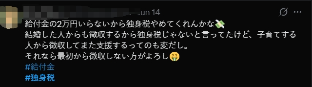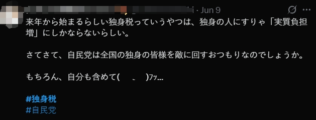 事實上,日本將要設立該制度的消息早已傳出。自去年年末以來,日本社交媒體上就出現了大量批評此制度的評論,「為什麼沒有孩子的單身人士要承受這種負擔」、「這不就是單身稅嗎」等,這些批評聲音的帖子閱讀量高達數百萬。