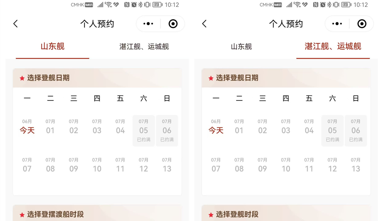 【橙訊】由山東艦航母組成的海軍艦艇編隊,周四(7月3日)起一連5日訪港,其中山東艦、湛江艦及運城艦,將在周六(7月5日)及周日(7月6日)開放給香港市民參觀,10,000張參觀票今日開放給公眾預約。上午10時首節預約10分鐘內,兩日參觀時段已約滿。不過,今日下午3時、晚上8時仍可預約,感興趣的市民萬勿錯過。