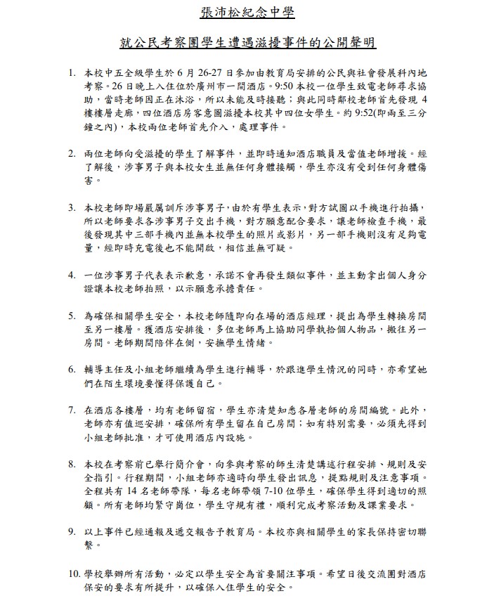 張沛松紀念中學早前亦發出公開聲明,正式回應事件。聲明指,該校中五全級學生在6月26至27日參加由教育局安排的公民與社會發展科內地考察。26日晚上時入住廣州市一間酒店。到了晚上9時50分時,一位學生致電老師尋求協助,當時老師因正在沐浴,所以未能及時接聽。與此同時鄰校老師發現4樓樓層走廊,有4位酒店房客意圖滋擾其中4位女學生,在約兩至三分鐘之內,學校兩位老師首先介入,處理事件。