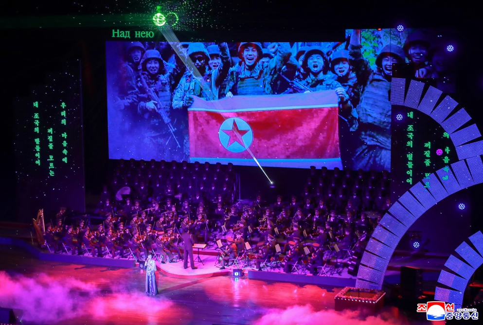 東平壤大劇院舉行了俄羅斯和北韓藝術家聯合演出,期間展示了北韓軍人在俄作戰相片。