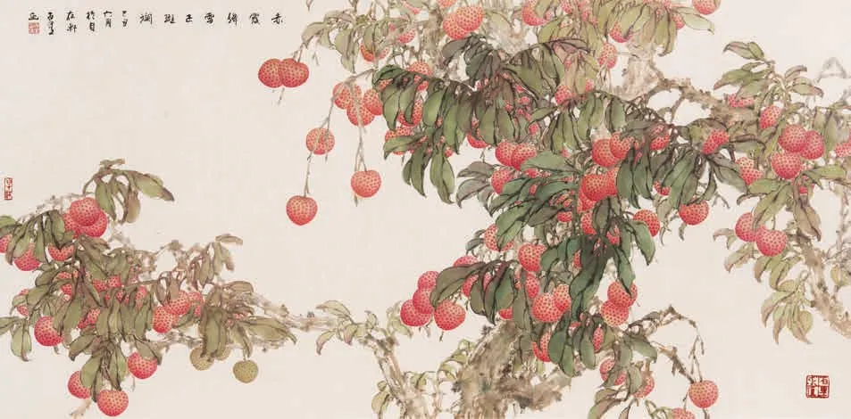 以荔枝夏果入畫,不僅是物象的再現,更是華夏文化基因的體現。藝術家以水墨為媒,將荔枝的圓潤與枝幹的蒼勁凝於尺幅之間,探索其形神之美與嶺南精神的共生關係,皆以獨特的藝術視角,詮釋這顆朱果背後的人文溫度與精神哲思。