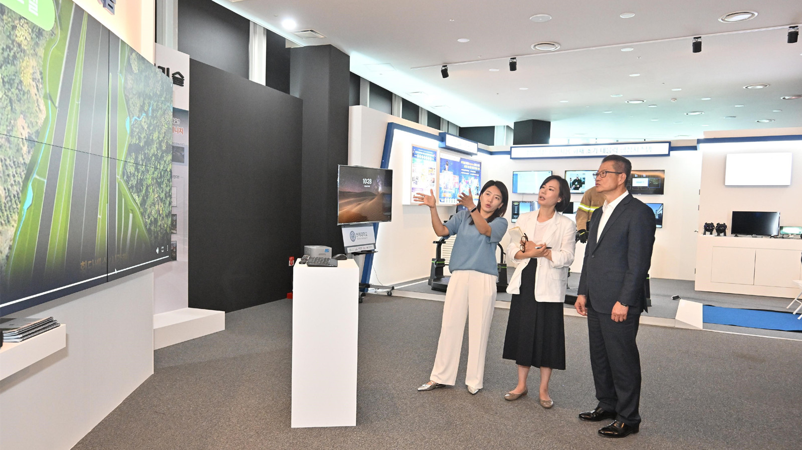 陳茂波今日也到訪了首爾的數字媒體城(Digital Media City)。數字媒體城匯聚了多家從事數字媒體、影視娛樂、遊戲動漫、信息科技等領域的企業,是首爾市政府主導建設的一個項目。陳茂波與其管理層會面,了解其發展歷程和發展規劃;並參訪了利用延展實境技術(extended reality)助力城市建設的展覽。