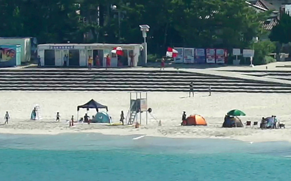 日本西部和歌山縣白濱的海灘邊,工作人員向遊客揮舞着海嘯預警旗。