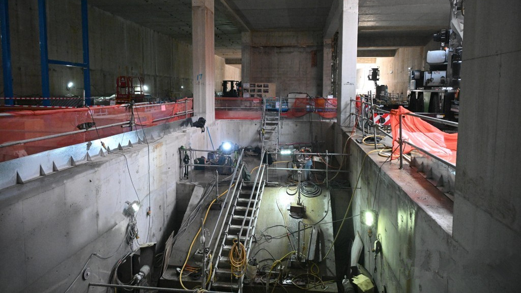 羅廸高說,車站土木工程的第一步是建造月台結構,亦是難度最高的一步。在興建落馬洲支線時同步建造的箱形隧道結構,當年內部共有超過90條,每條柱大約3噸重柱躉,協助穩定這個深入地底約20米深的隧道結構,以及抵銷地下水浮力。因此港鐵建造月台時,團隊先要拆除其中19條,共重約60噸的柱躉,每條柱躉需分3段切割及移除,以騰出空間興建月台。
