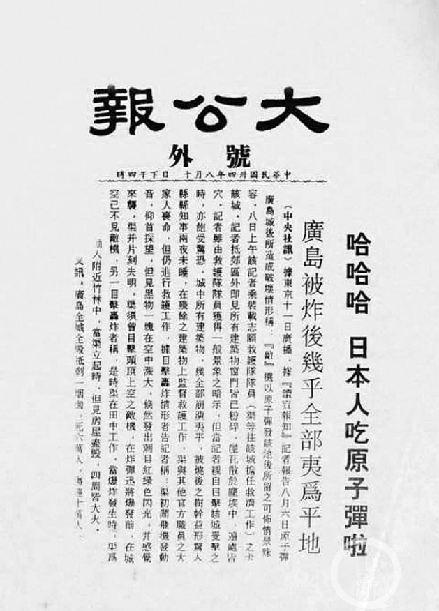 1945年,《大公報》刊發關於廣島原子彈爆炸事件的號外。