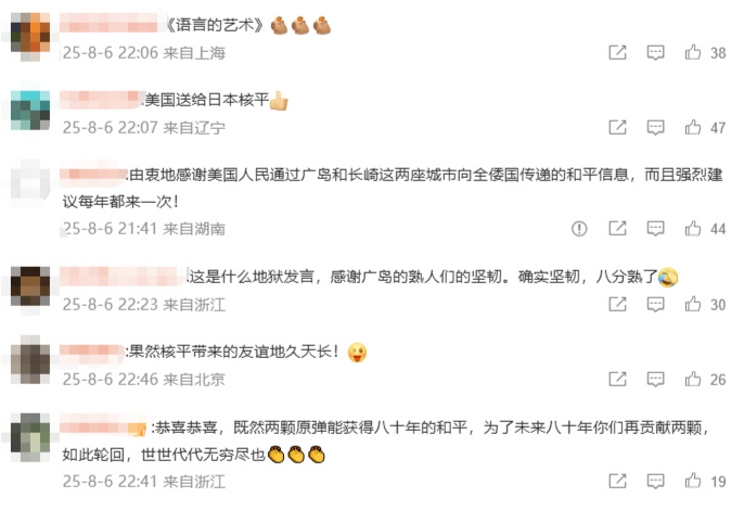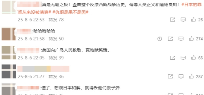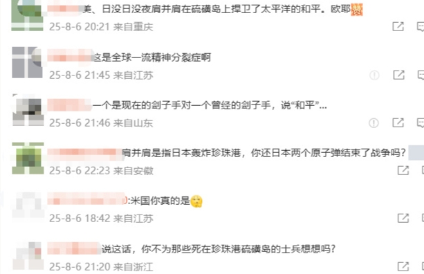 因此,美國此篇文章引發網友熱議。有網友嘲諷,「這是美國人語言的藝術」、「美國為日本送去核平」;還有網友指出,美國此番言論似乎在暗示日本也是戰勝國;甚至有網友為珍珠港死去的那些美國士兵「鳴不平」。